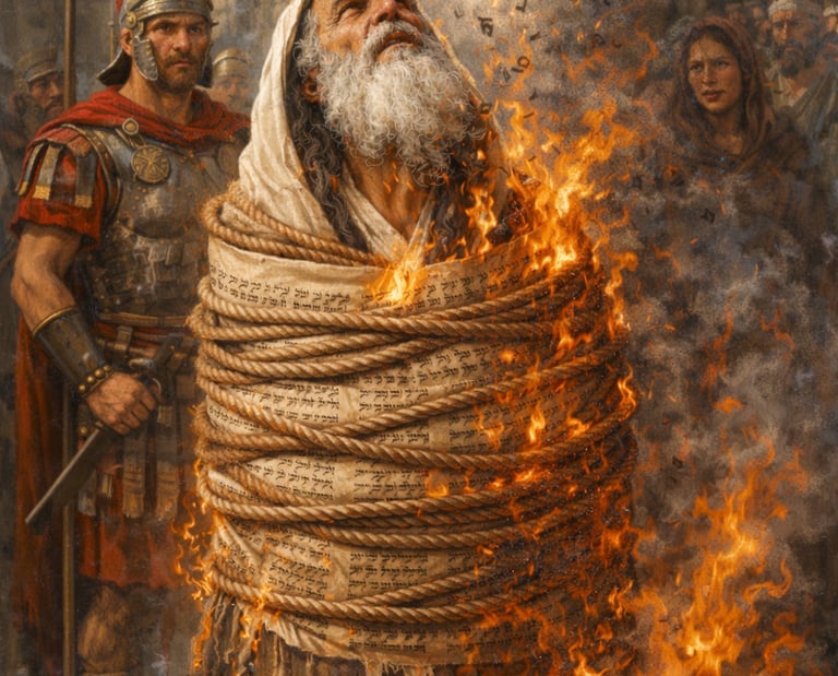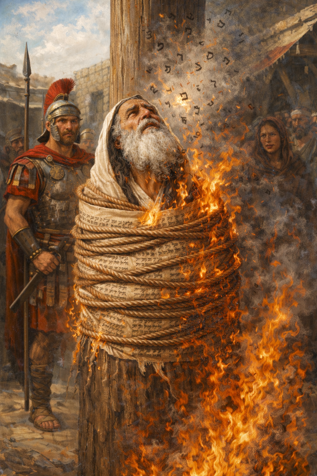 «Вывели рабби Ханину на площадь, обернули в свиток Торы и в таком виде возвели на костёр. Затрещал, охваченный пламенем, хворост. А палачи начали класть на грудь рабби Ханине волокна шерсти, напитанные водою, дабы подольше поддержать в нём дыхание и этим продлить мучения.